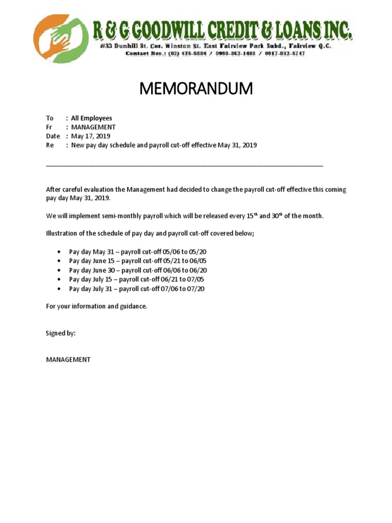 Memo advising staff of changes to make office better email notifing the change of hours for the office awards ceremony shift change and leaving early memo to staff announcing shift differential to employees. My employer just changed our payroll format from w2 to 1099 because she said she was losing too much money by paying our taxes. For example, you would send a payroll memo if an upcoming holiday causes a change in employees' payroll date or if. Change employment or job information. Business & finance > corporations > working > memorandum.